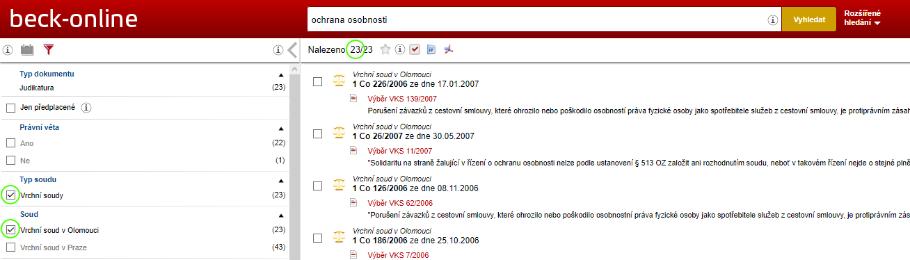 Hledáte např. judikaturu k ochraně osobnosti z VS v Olomouci ? Postupujte následovně. Nejprve zadejte hledaný text a pak už stačí v levém panelu vybrat položky, které Vám Beck-online nabídne: